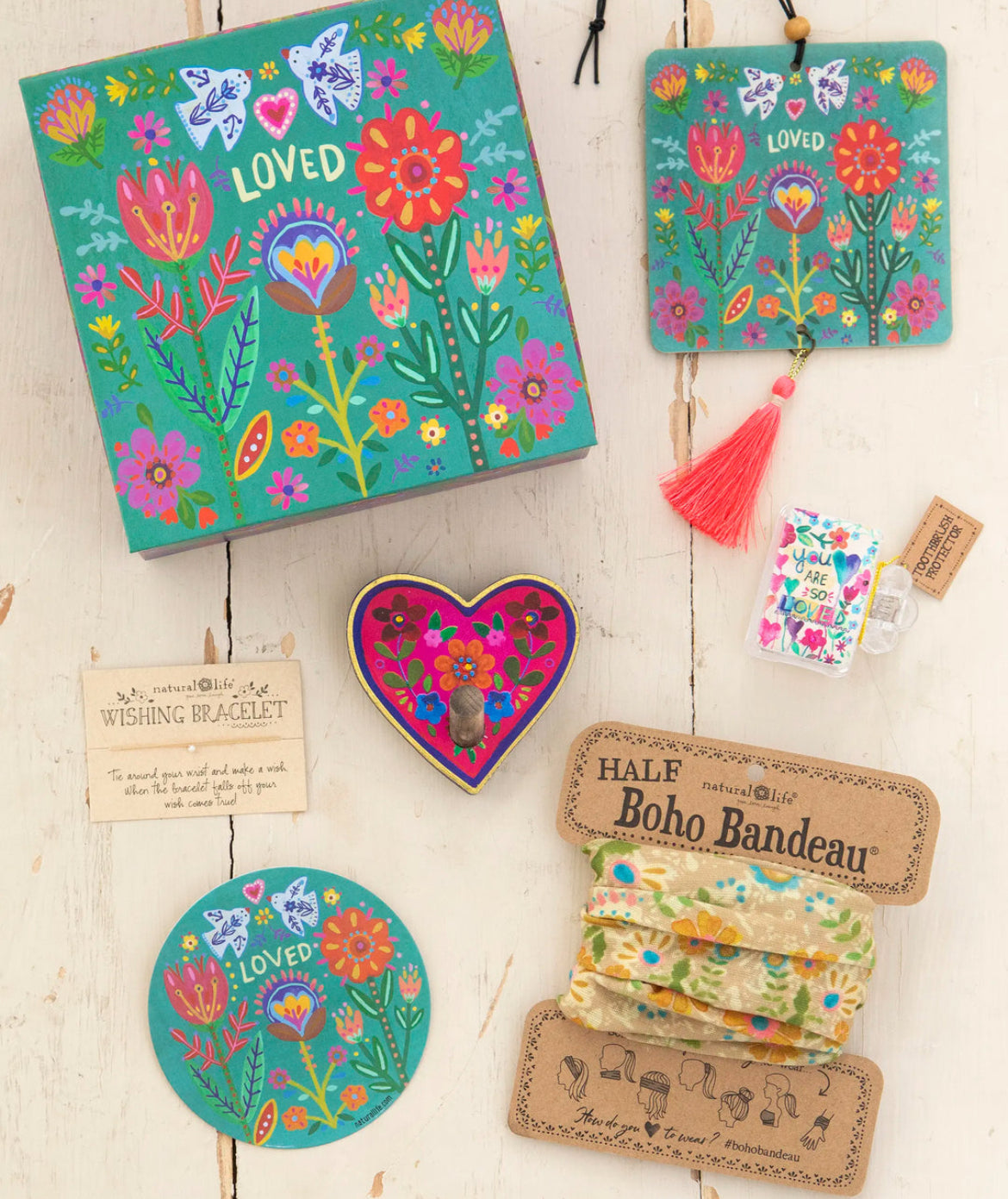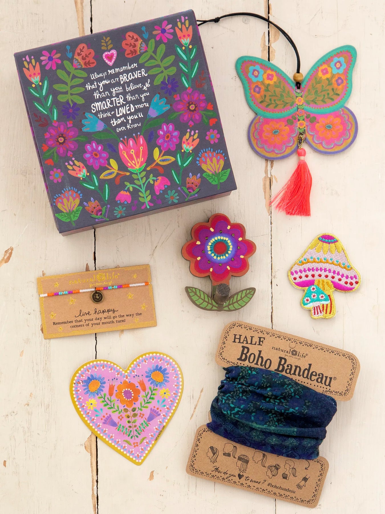 - 6 Irresistible Treasures! Includes: Wooden Wall Hook, Giving Bracelet, Patch, Half Boho Bandeau®, Air Freshener & Sticker