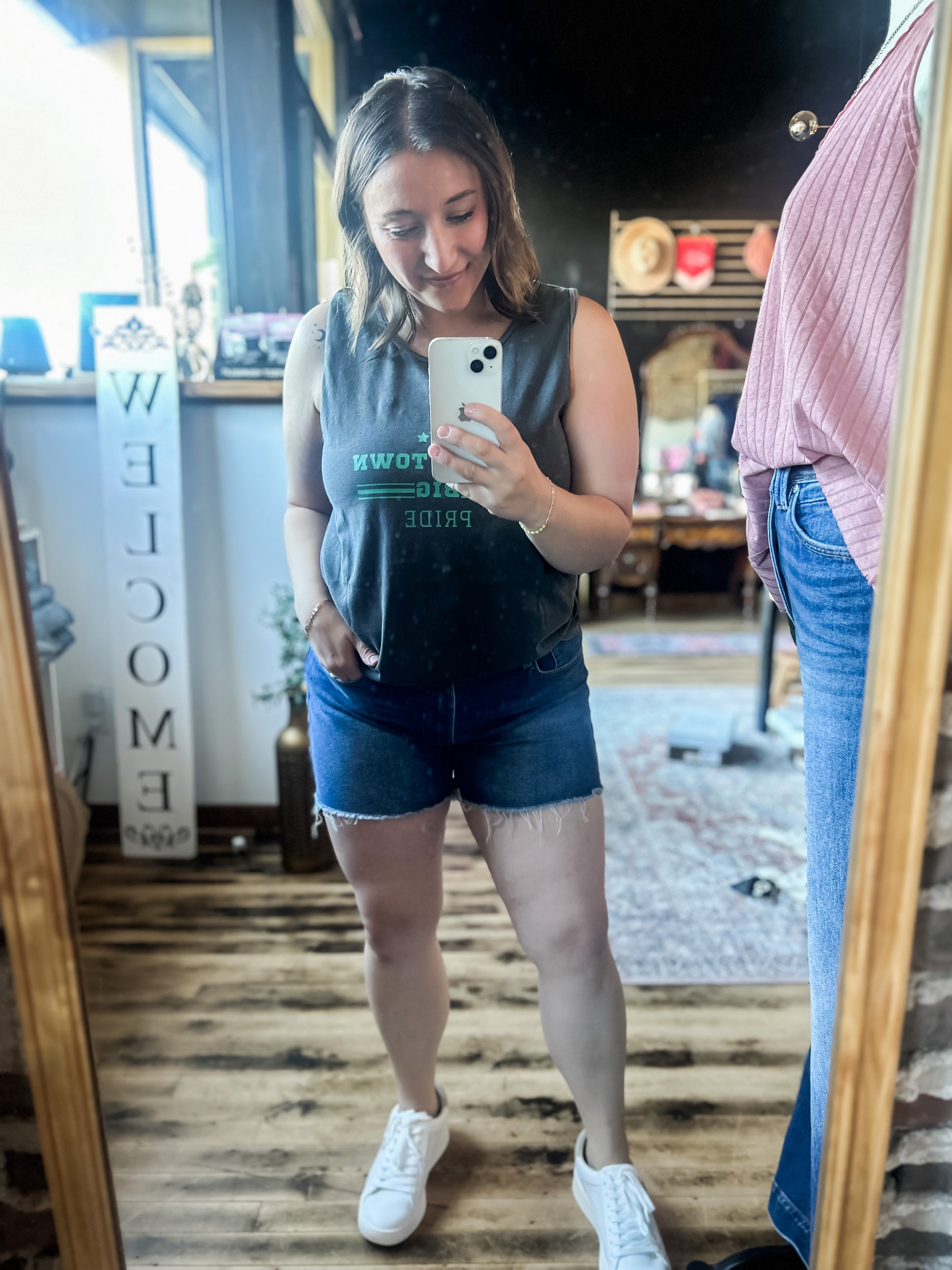Dark Wash Type: Shorts Closure Type: Zipper Fly Details: Pocket, Raw Hem Waist Line: High Rise Fit Type: Regular Fit Fabric: Stretch Material: Denim Composition: 85% Cotton, 14% Polyester, 1% Spandex Size S, Model is 5'9" Waist - 30" Hip - 39" Front Rise - 10 1/2" Leg Opening - 22 3/4" Inseam - 4"