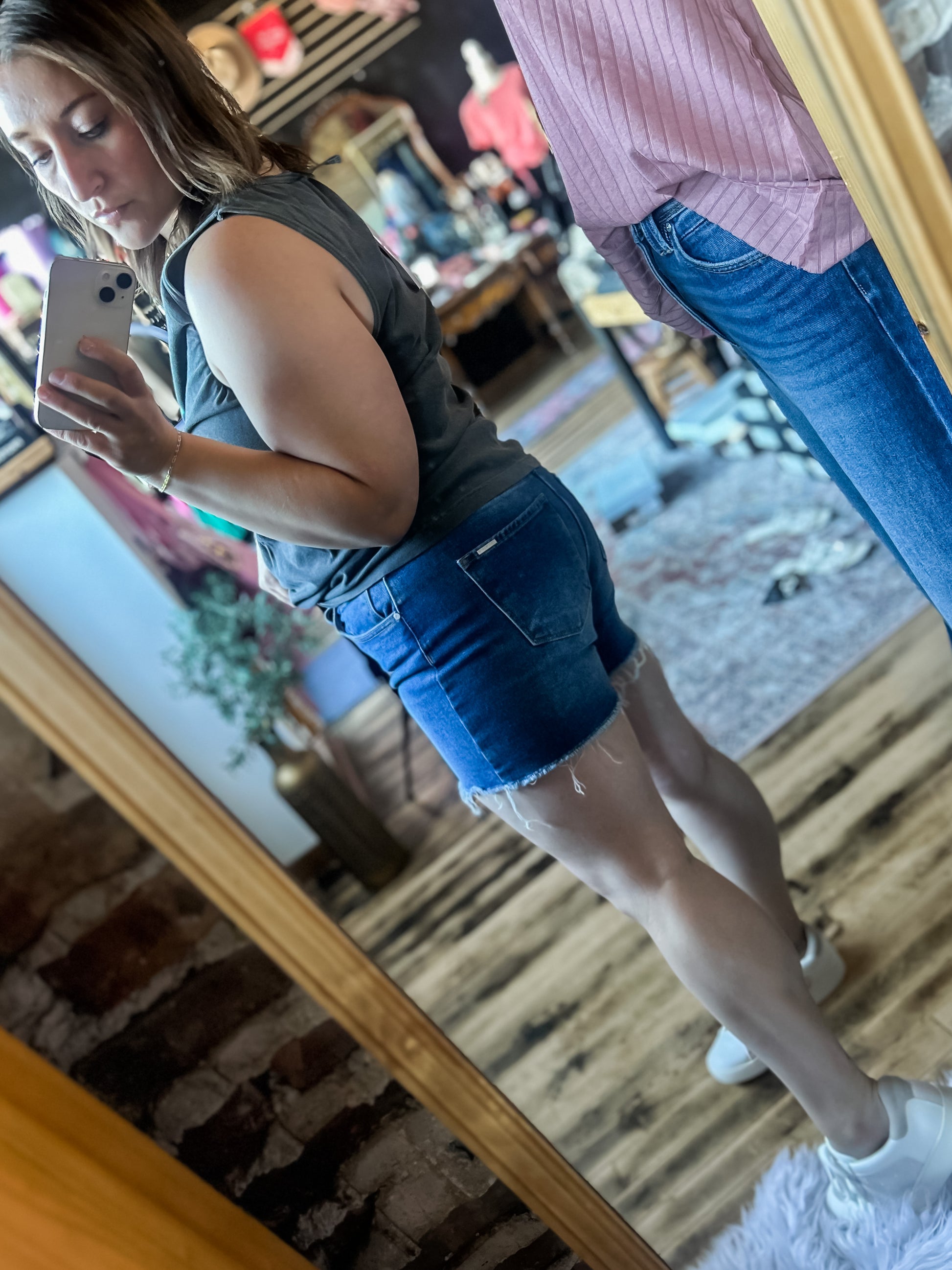 High Rise Trim Midi Stretch Denim Shorts