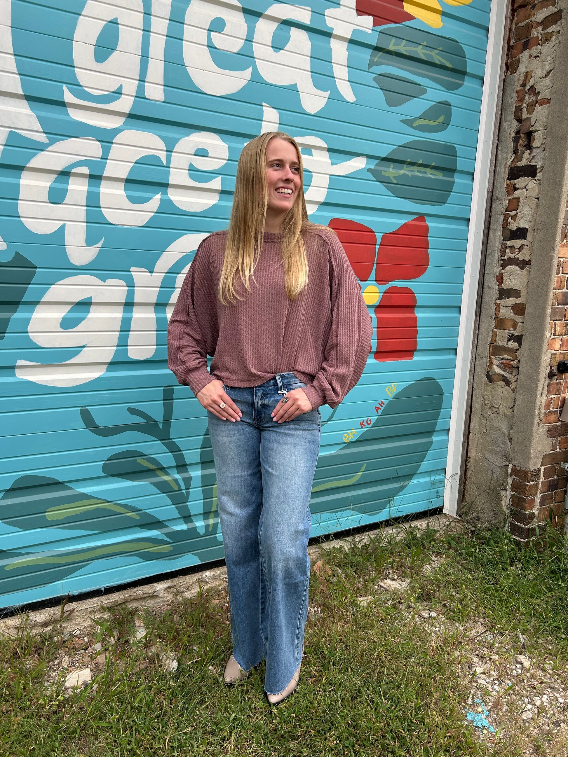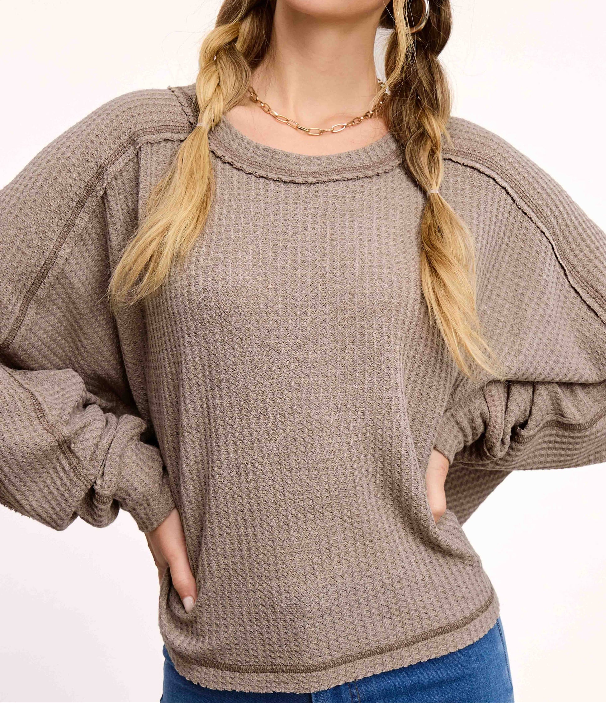 Embrace cozy vibes with this Waffle Fabric Loose Fit Long Sleeve Top. Crafted from lightweight, brushed waffle knit fabric, it offers a delightful texture and soft feel perfect for lounging or casual outings. The playful batwing sleeves and slouchy fit provide freedom of movement, while the round neckline adds a classic touch. Its raw-cut straight hemline gives it a relaxed, effortlessly cool look. Whether you're unwinding at home or stepping out, this top blends comfort and style with ease.