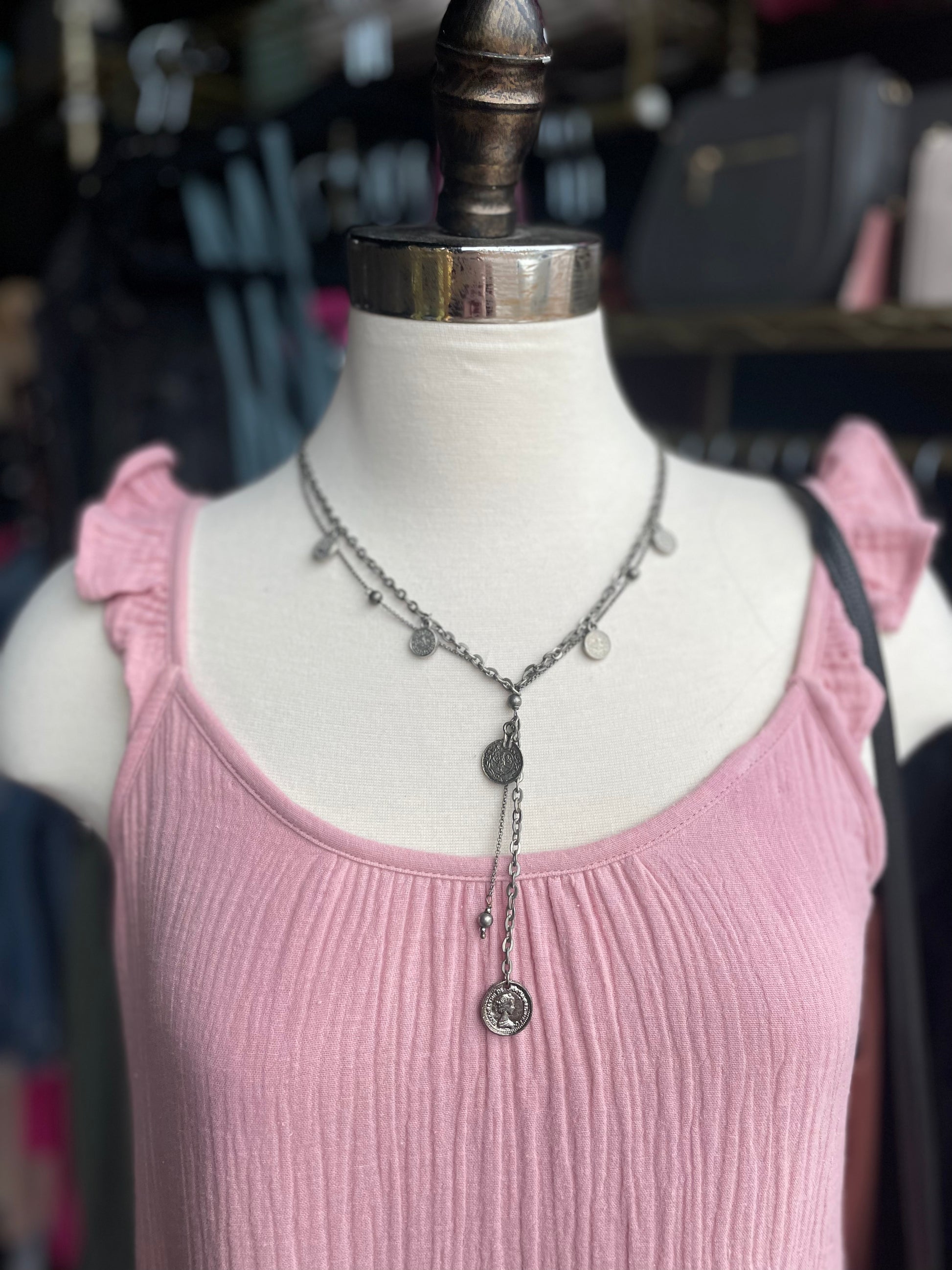 You'll be the talk of the town in this Silver Token Layered Necklace. It's sparkly, stylish, and sure to turn heads! A perfect accessory to add some glitz to any outfit. Strike a deal on this silver beauty today!