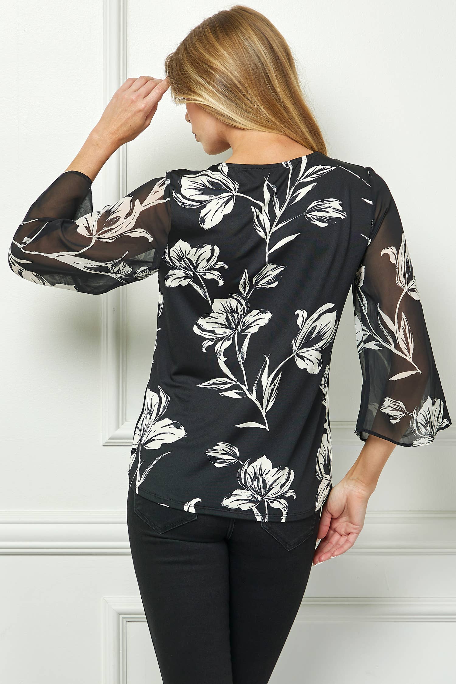Crafted from soft, brushed DTY knit with added stretch, this printed blouse features a flattering jewel neckline with keyhole detail and comfortable 3/4 length sleeves. The vibrant floral prints and silky-smooth feel make it perfect for both casual and dressy looks. Ideal for work, gatherings, or everyday wear.